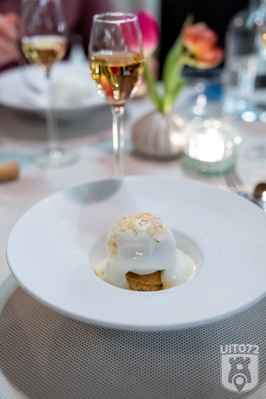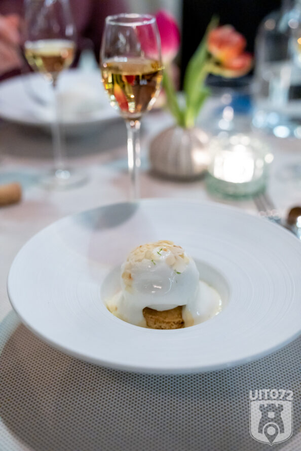 Dan volgt al weer het laatste gerecht, het dessert. Citroen Crème Anglaise met amandelkoekje en merengueschuim. Heerlijk citroenijs verborgen onder merengueschuim met onderop een halfzacht amandelkoekje. Echt heel lekker.