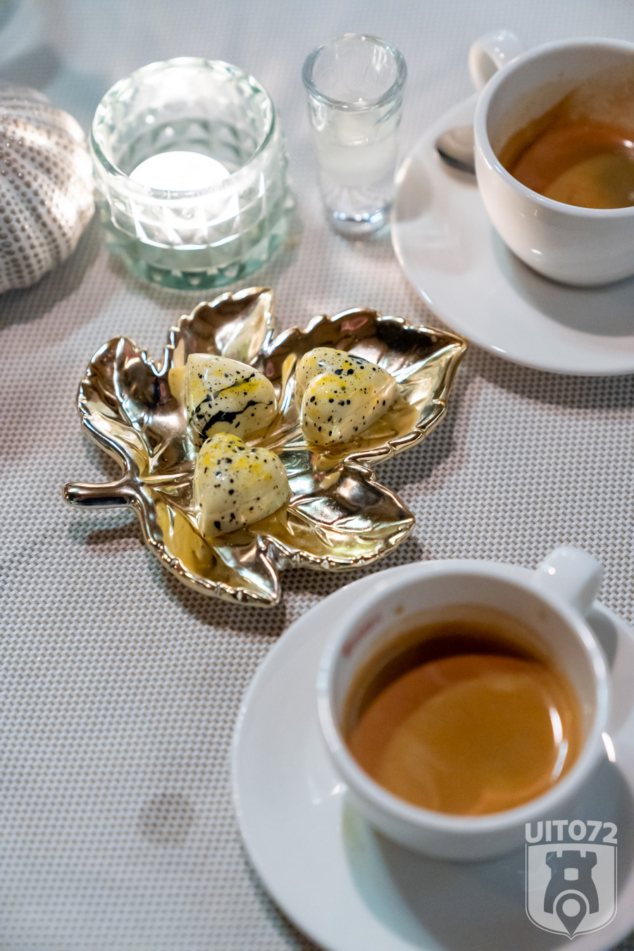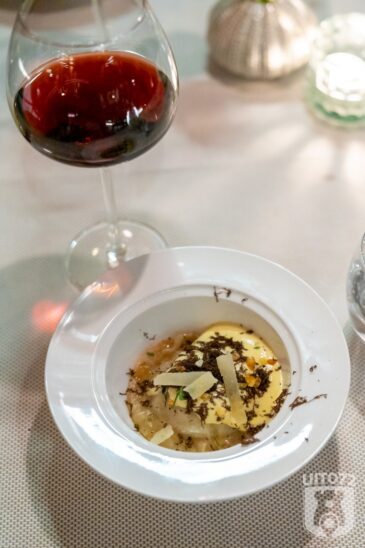De derde gang is een ravioli gevuld met verse truffel en knolselderij, in een schuim van Parmezaan. De truffel en knolselderij vormen een goed huwelijk, de smaak is aards en een beetje zoetig. Echt een heerlijk vegetarisch gerecht.