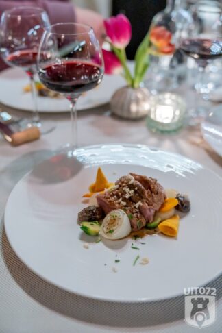 De wijn die we er bij krijgen is een Spätburgunder Trocken. Over deze wijn weet Elvira ons te vertellen dat dankzij de klimaatverandering deze Duitse equivalent van de Pinot Noir over de jaren heen beter en beter is geworden. De lichte en soepele rode wijn vult de ravioli mooi aan, zonder te overheersen. Hadden we al gezegd dat het niveau hoog is?