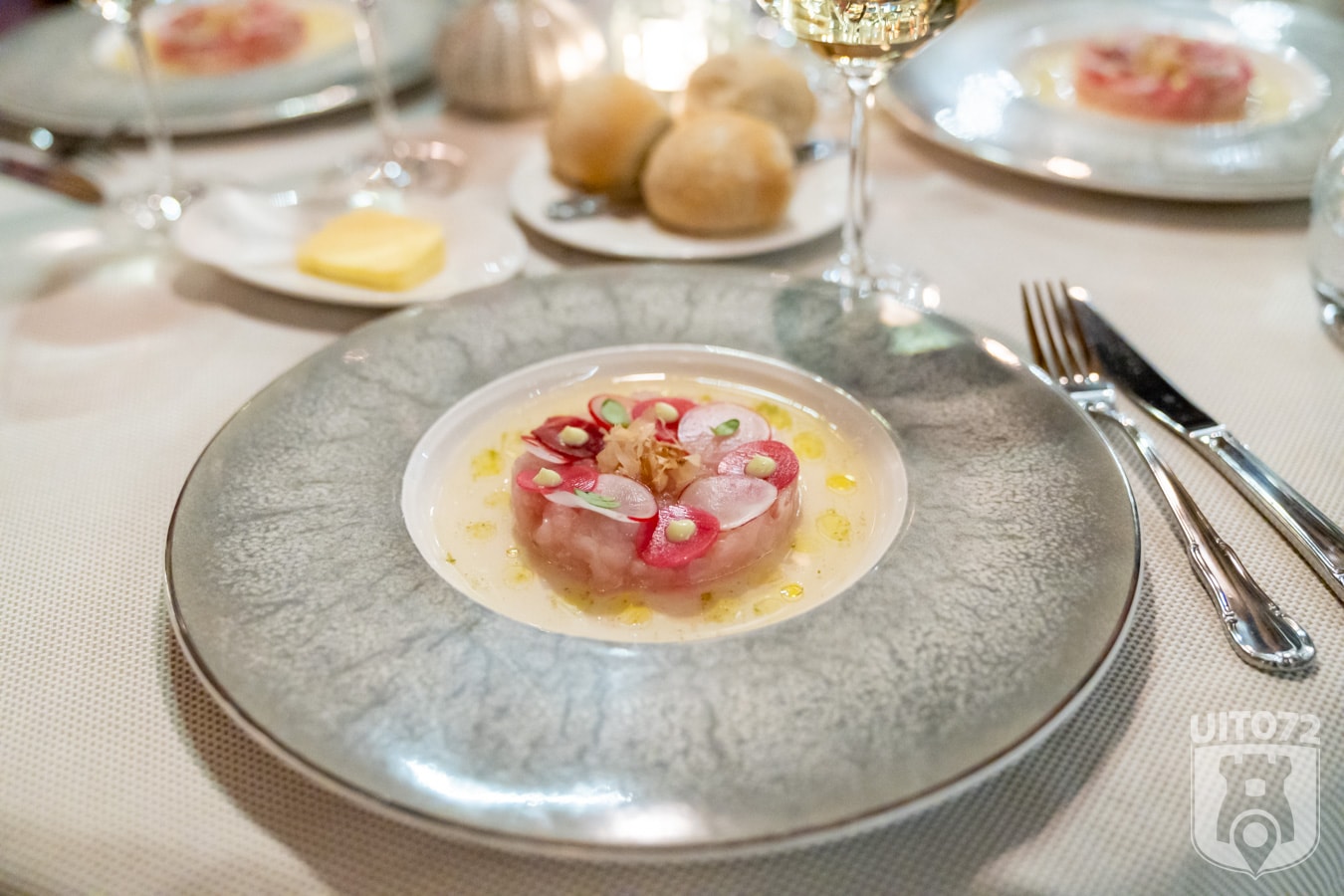 Het voorgerecht: een tartaar van zeebaars met yuzu in een gelei van kombu met bonito vlokjes en yuzu mayo. Hier treffen we meteen een combinatie van klassiek Frans met moderne Oosterse invloeden.