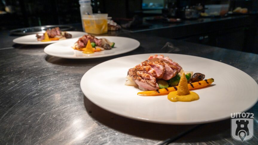 Gang nummer vier is Canette met gésiers confit de canard, gegrilde groenten en een maissausje. Canette is eendenborst van de vrouwtjeseend. Deze is smakelijker en malser dan die van de mannelijke eend. Gésiers confit zijn gekonfijte eendenmaagjes, een delicatesse.