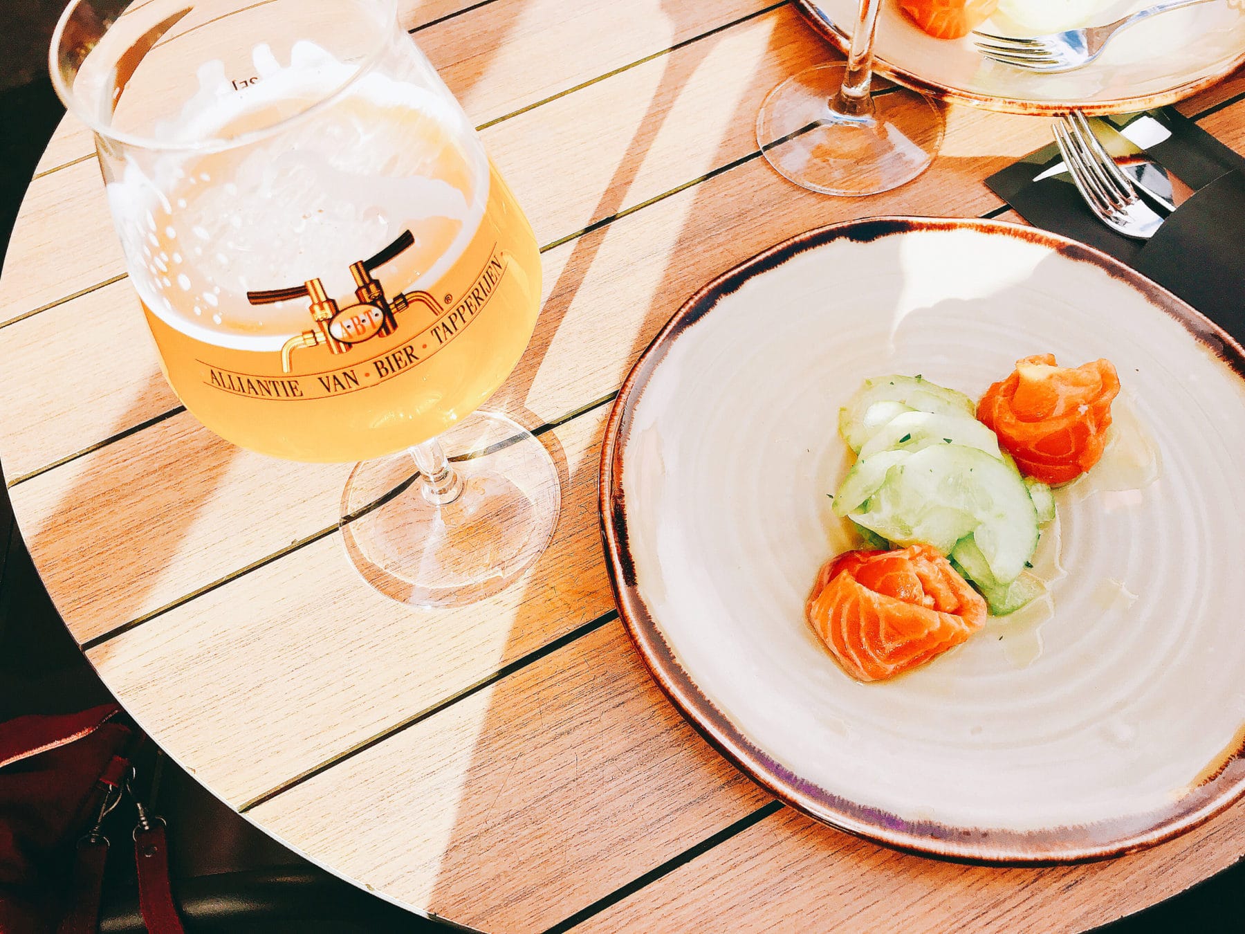 Biersommelier Richard heeft ruim 15 jaar in de keuken gestaan bij De Vrolijke Pater, en draait zijn hand niet om voor een bijpassend gerecht. Met veel enthousiasme licht hij toe dat de zalm 48 uur gemarineerd is in Duchesse de Bourgogne, een Belgisch bier met gemengde gisting met een zoetzure smaak. De friszure smaak past goed bij het zachte witbiertje, bestaande uit 30% tarwemout, en specerijen meegebrouwen. Erg zacht en fijn van smaak.