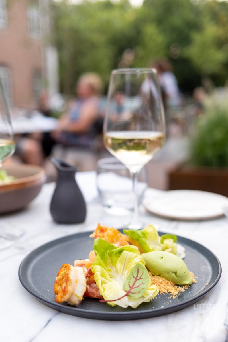 De twee voorgerechtjes die ons van de kaart werden aangeraden, zijn zomers en goed behapbaar. Mooi opgediend, maar verwacht geen enorme porties. De wilde gamba’s (twee stuks) zijn goed op smaak en een prima combi met ham en meloen.