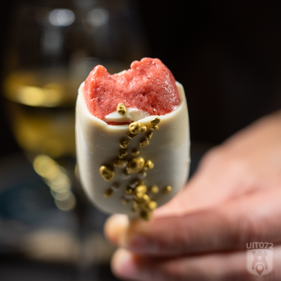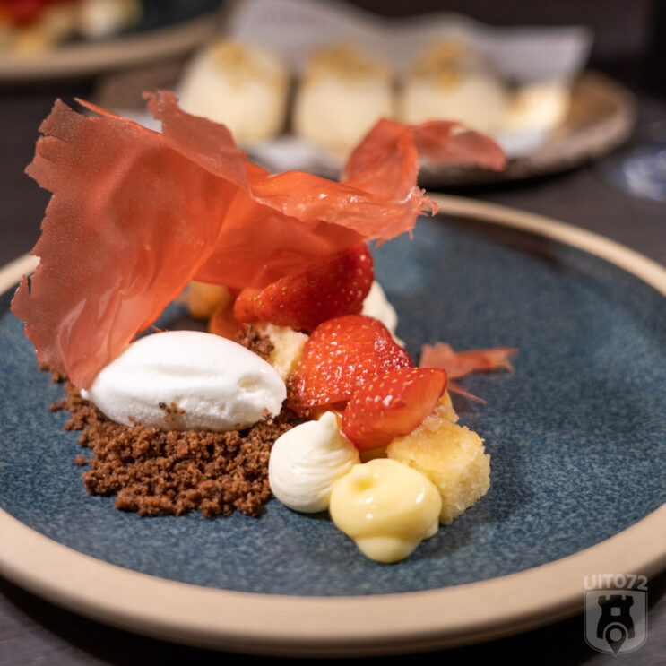 Het dessert van aardbei crème met karamelyoghurt, lemon curd en rozenijs smaakt verrukkelijk. Als kers op de taart krijgen we huisgemaakte witte mini-magnums gevuld met frambozen sorbetijs voorgeschoteld. Hemels!