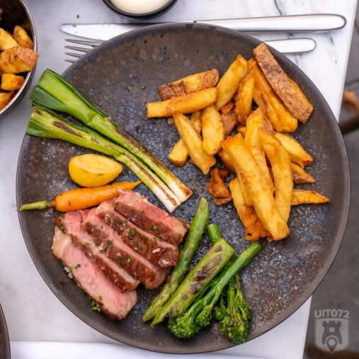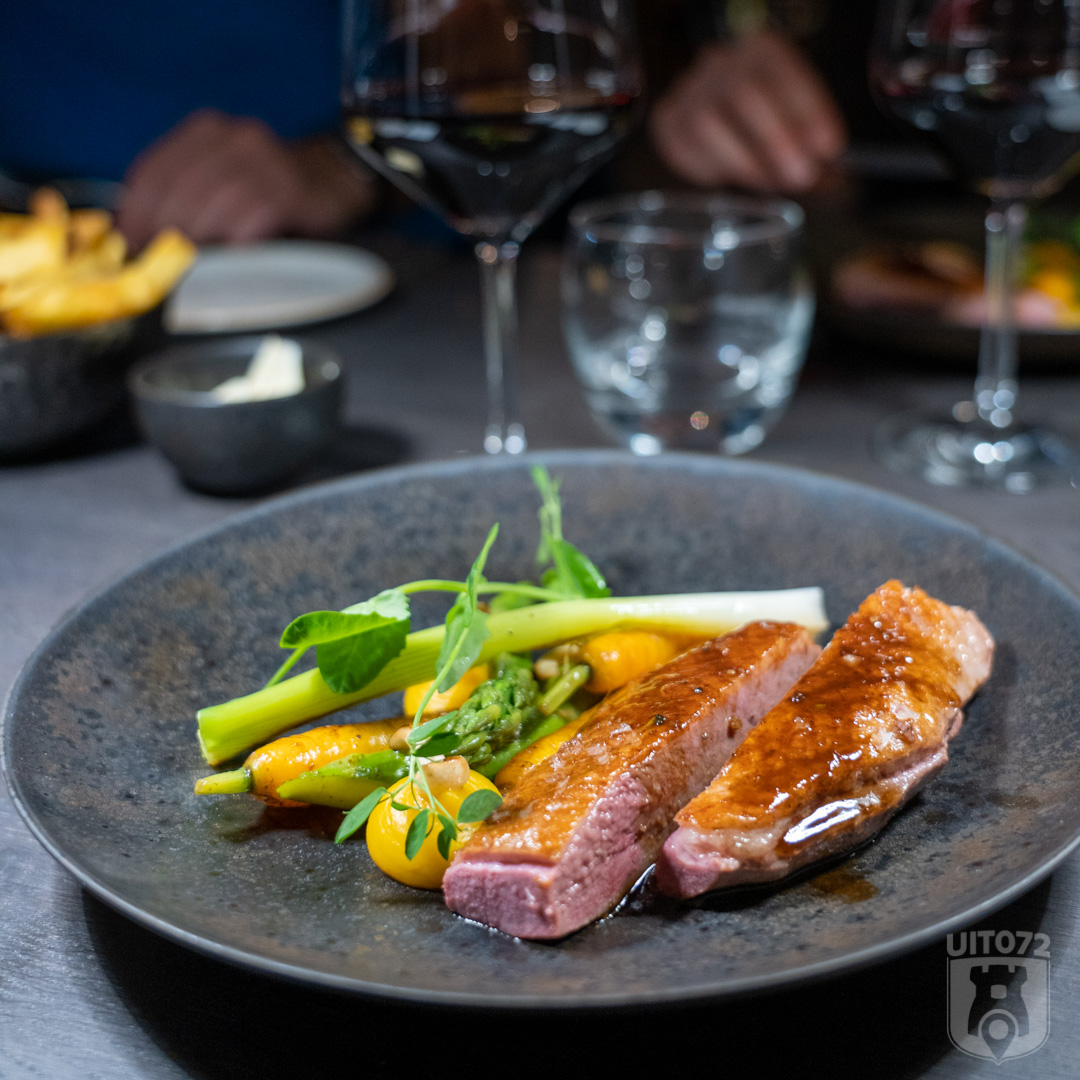 Het hoofdgerecht volgt al gauw. We doen ons te goed aan Franse eend met bosui, Ras-el-hanout, bospeen en enoki. Het heerlijk malse vlees en de fijn gekruide groenten maakten dat ons bord tot de laatste druppel leeg ging. Een rode wijn uit de zuidelijke Rhônevallei van wijnhuis Ogier vergezelt deze canard en doet dat met verve.