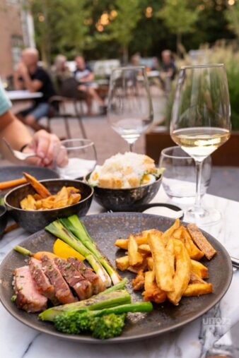 Erbij gegrilde groenten (asperge, bospeen, lente-ui), friet van Friethoes, Bearnaisesaus en een Ceasarsalade.