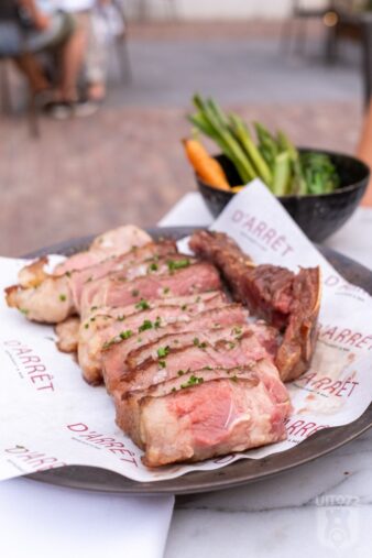 Het hoofdgerecht mogen we delen en wordt aangekondigd als “een soort grote entrecote”. We vermoeden een côte à l’os, of wat ze in de VS een club steak noemen. Goed gekruid, maar wel érg veel niet aangebakken vetrand. De steak zelf mag juist een stuk minder doorbakken.