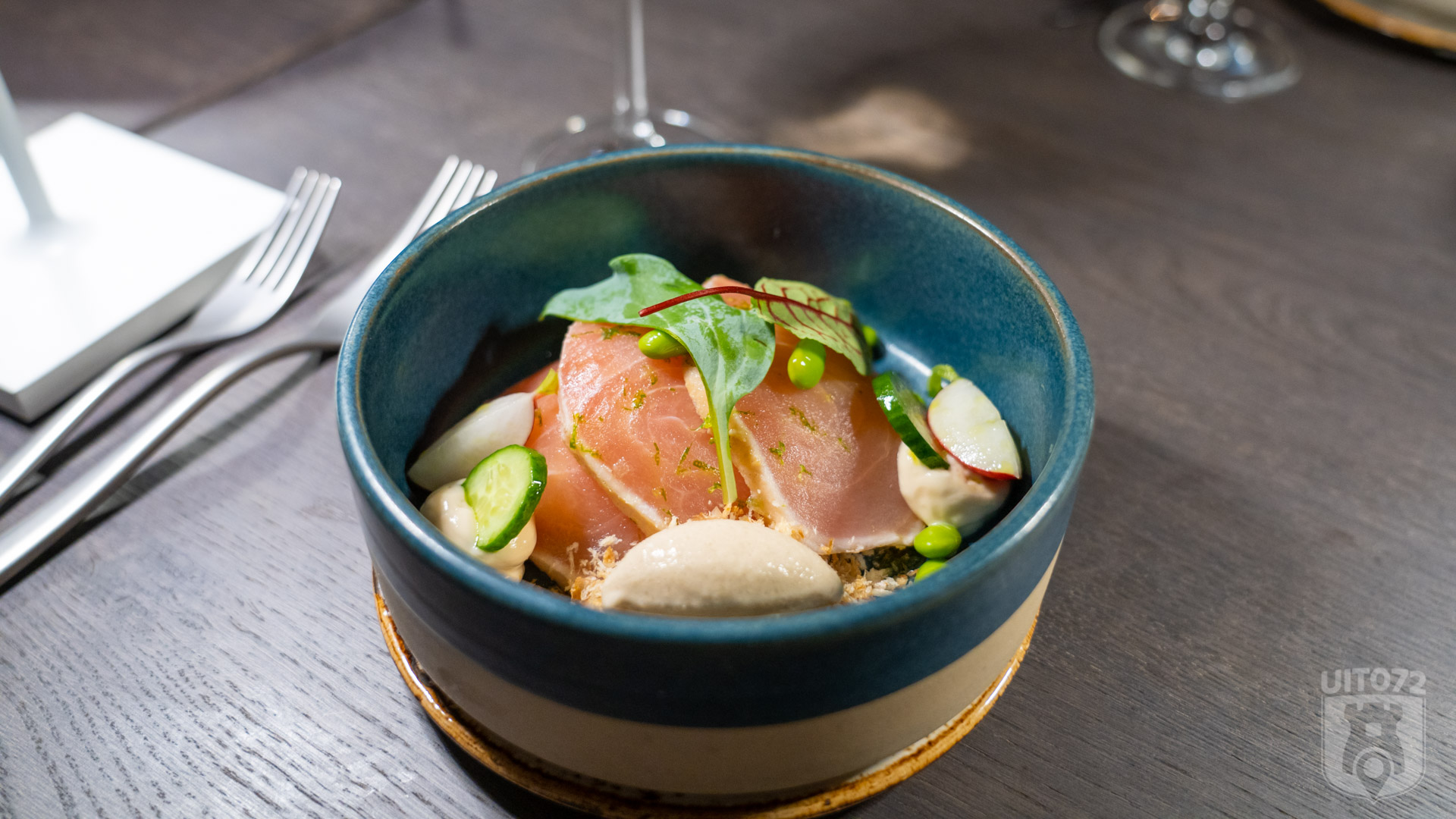 Het menu begint met een mooi opgemaakt voorgerecht van zwaardvis met langoustine-ijs op sushirijst met een kruidige cocktailsaus. Edamame en radijs zorgen voor een knapperige bite.