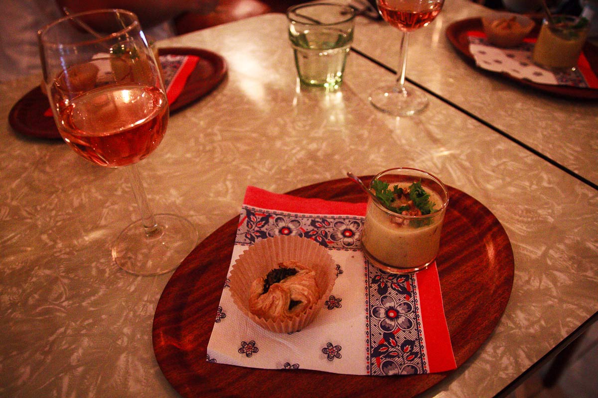 We beginnen met een klein voorgerecht. Soep – hoe kan het ook anders – vanuit de moestuin met een pittig koekje van spinazie. Noukka eet alsof ze dit soort dingen dagelijks eet (hahaha), de vleeseters kijken elkaar aan: dit is prima te doen. Meer dan prima zelfs!