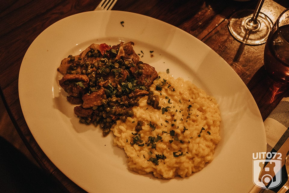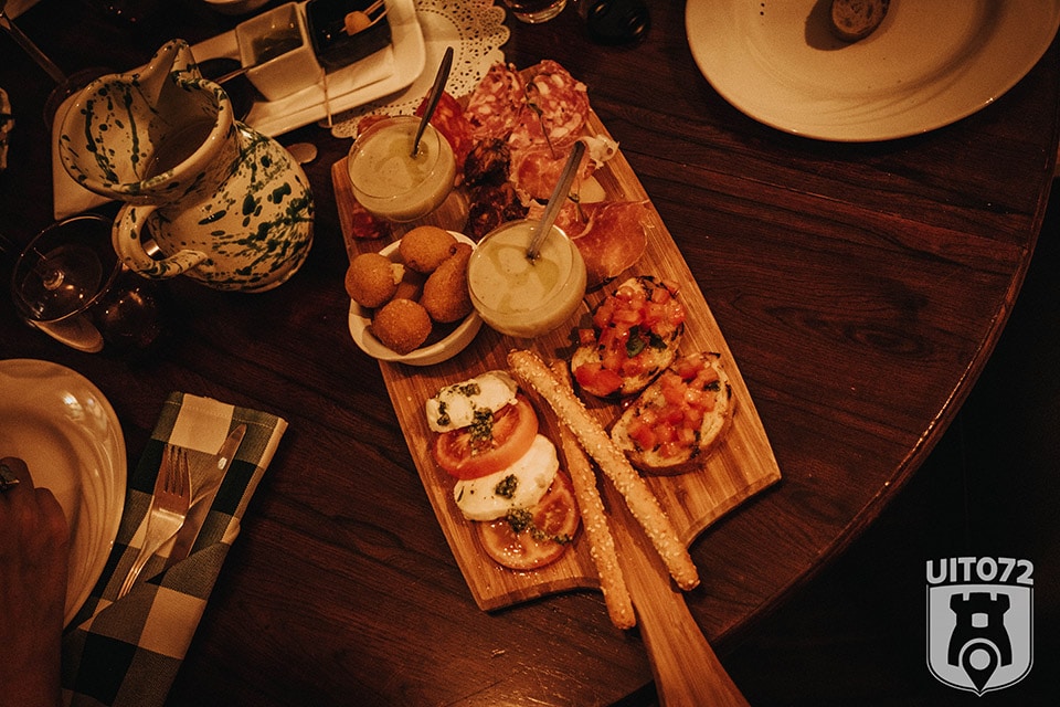 Daarop vinden we een venkelsoepje met bleekselderij, 3 soorten salami, parmaham op meloen, bruschette met gemarineerde tomaat, 3 soorten vega bitterballetjes gevuld met olijven, mozzarella en risotto en caprese salade. Helemaal geen verkeerde starter. De salami varieert van mild tot licht pittig, de meloen en parmaham is heerlijk en op de goed gekruide soep is niks aan te merken. Er is niet bezuinigd op kleine porties, dit is gezellig samen met vrienden genieten van lekker eten en een goed glas wijn.