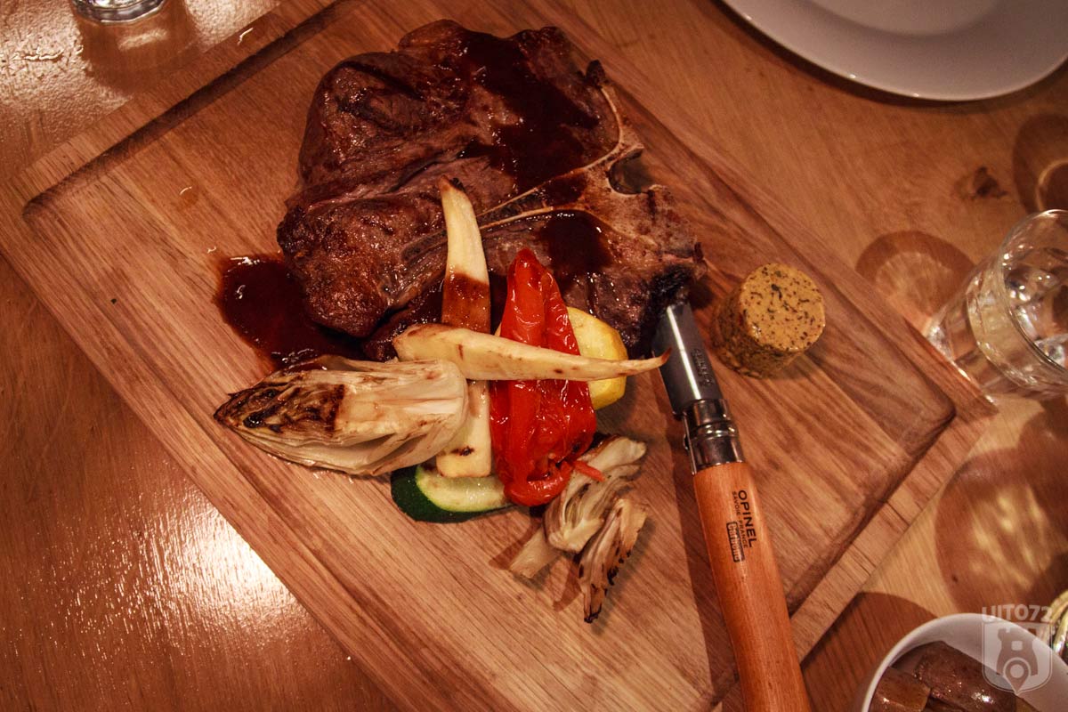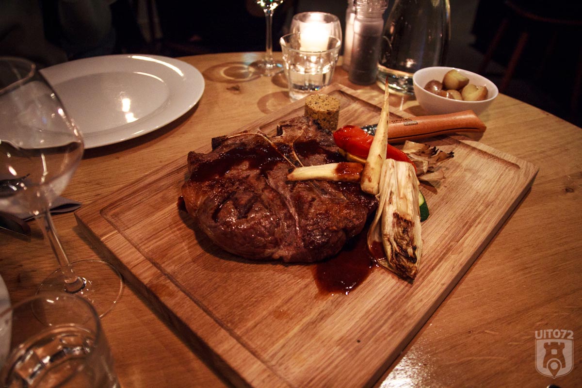 En de hoge verwachting wordt waargemaakt. We beloven: hier wordt je stil en blij van, als je van vlees houdt! Een prachtig stuk, sappig, hout gegrild en ruim voldoende voor 2 personen.