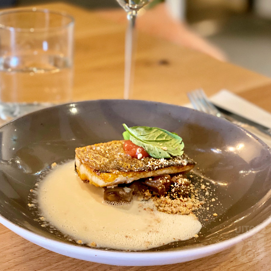 De zeebaars is zoals we gewend zijn van Fnidsen: perfect gebakken, met een lekkere beurre blanc saus. De Roemeense Sauvignon Blanc is verrassend, goed passend en zeker 1 van de lekkerste wijnen van deze wandeling. Tot nu toe de beste combi! Maar er komen nog twee uitdagers…