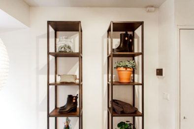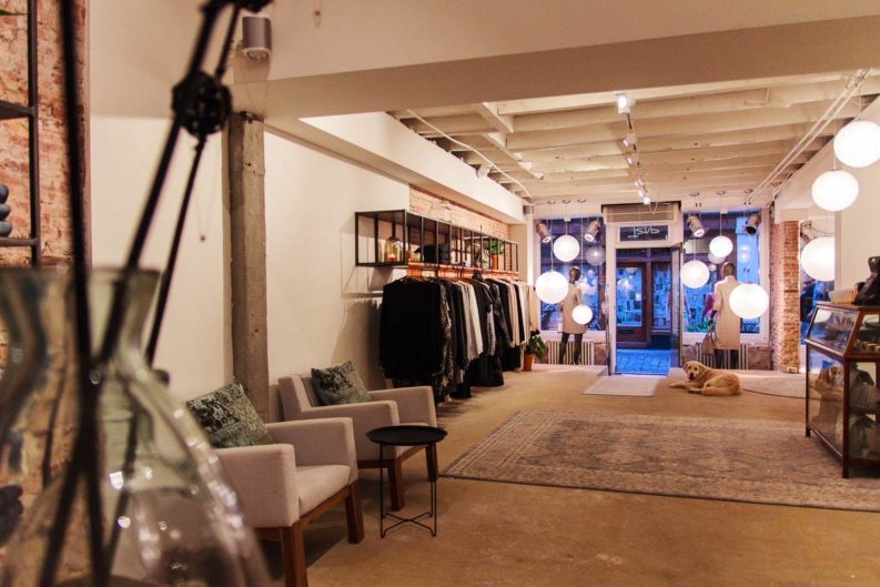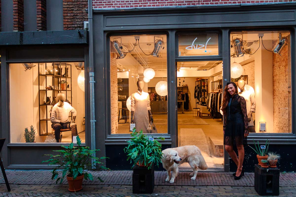 Ja, samen met mijn man heb ik de winkel ingericht. Piet Jan van den Kommer heeft samen met ons de kledingrekken, paskamers en spiegels ontworpen. Hij begreep precies wat ik wilde. Het is een beetje industrieel maar wel warm door middel van de kleden en de mooie lampen. We zijn geen lampenwinkel, maar mensen zijn er wel al op binnen gekomen. Ik vind zelf het contrast met de muur en het staal heel mooi. De paskamers zijn heel ruim en het overallgevoel wat je hier krijgt is vooral rust. Mijn hond Henk valt af en toe bijna niet op als hij op één van de kleden ligt. Henk is hier elke dag en blend dus lekker mee in het interieur. Tot nu toe heeft hij de meeste likes gekregen dus we moeten er voor zorgen dat hij geen sterallures krijgt!