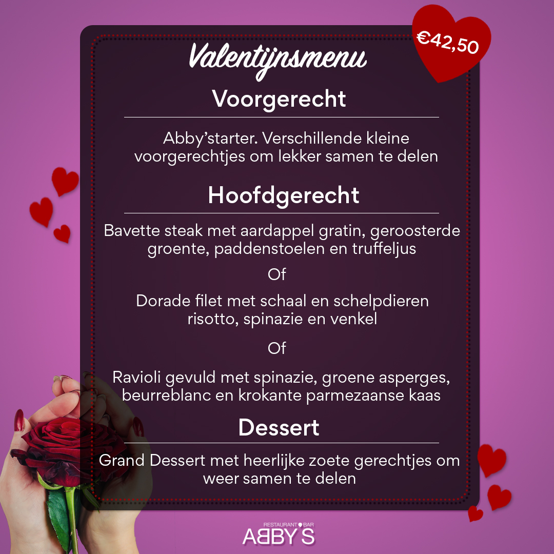 Ook aan het Ritsevoort is het genieten op Valentijnsdag. Abby’s schotelt je een heerlijk 3-gangen diner voor. Je start met een selectie aan voorgerechtjes die je lekker met elkaar kan delen. Kies dan voor de dorade, bavette steak of ravioli en sluit samen af met een grand dessert.