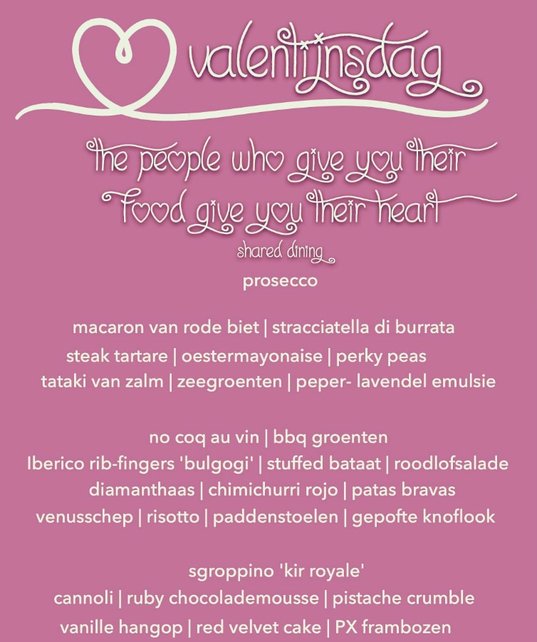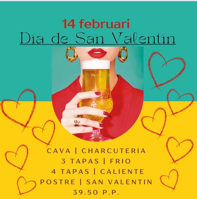 Dia de San Valentin. Heerlijk Spaans tafelen met je betere helft/date/vlam. Ook hier begin je met een glaasje bubbels en charcuteria. Dan volgen 3 koude en 4 warme tapas. Je sluit af met een postre San Valentin.