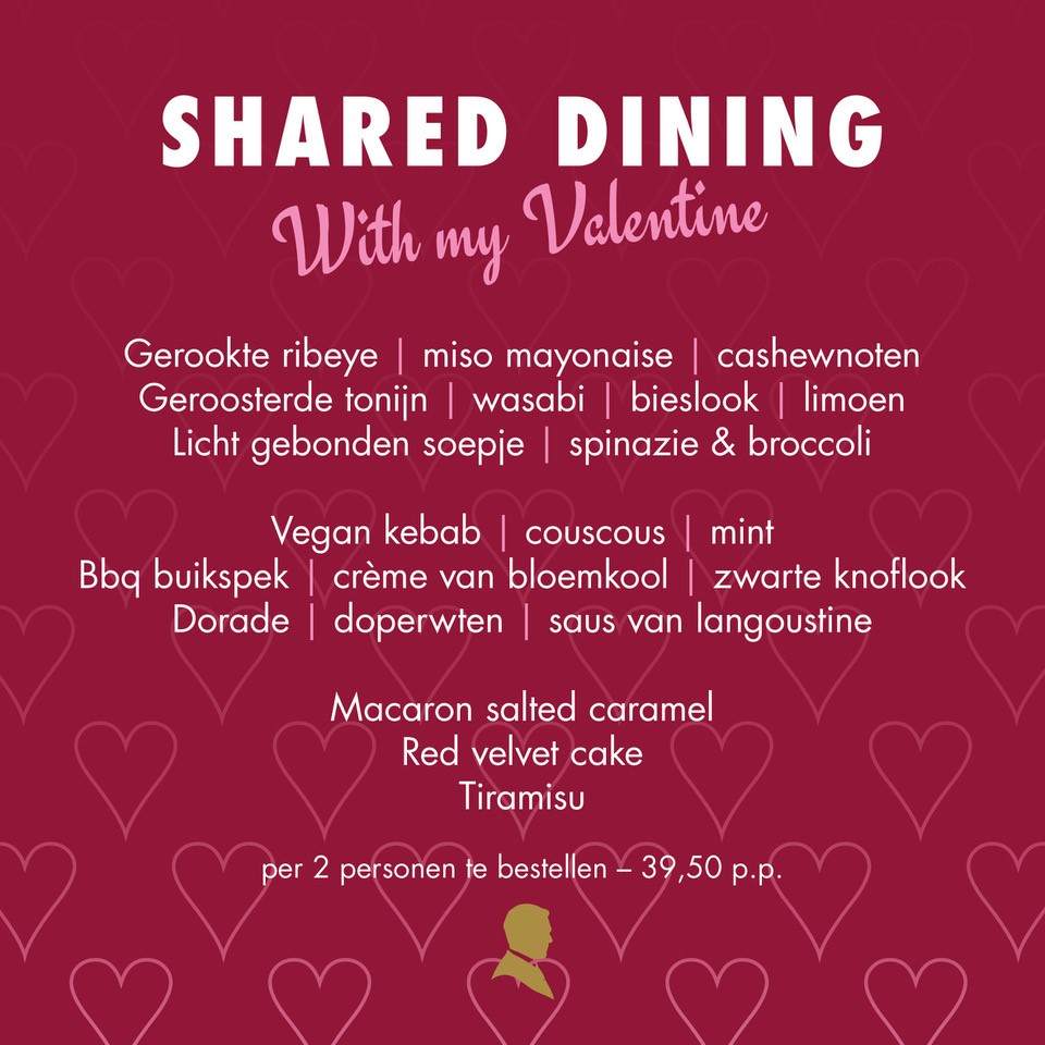 Liefde gaat door de maag en daarom heeft Mojo’s een shared dining 3-gangen menu samengesteld. Je kunt kiezen uit onder meer cocktail van rivierkreeftjes, peking eend, zalmtartaartje, ossenhaasmedaillon en skreifilet. Afsluiten doe je met een grand dessert. Samen genieten op Valenstijnsdag van eten, drinken en elkaar op het gezellige Waagplein.
