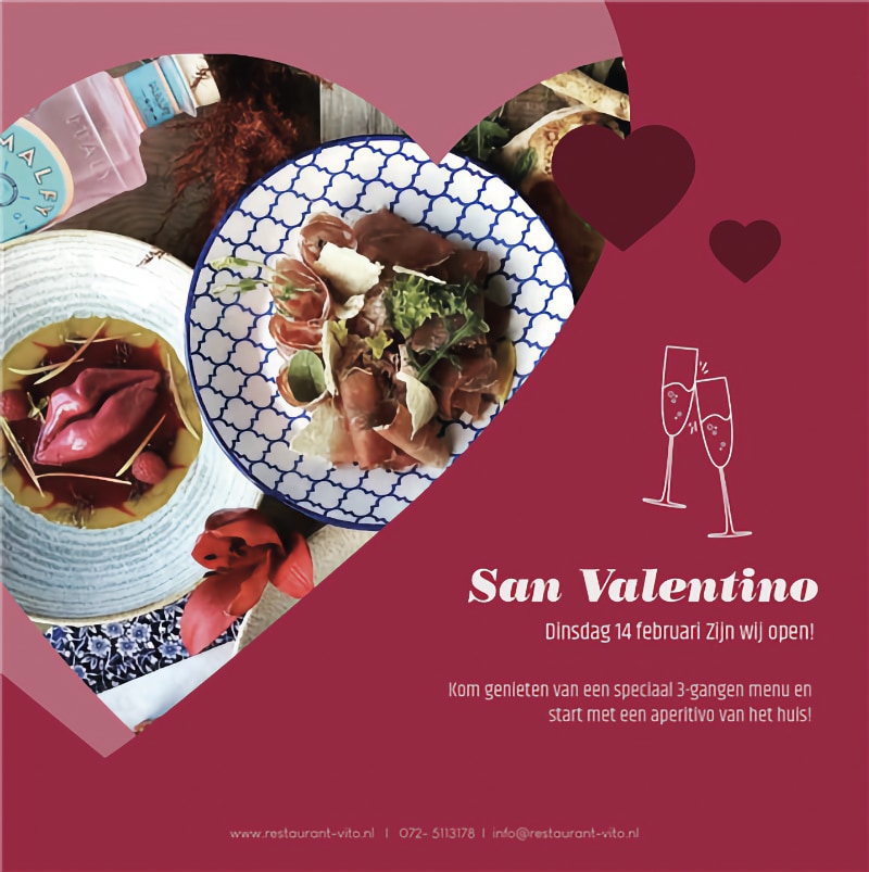 Wat is romantischer dan met je amore de liefde te vieren met een Italiaanse San Valentino? Bij Vito geniet je van een 3-gangen menu met vooraf een proeverij van verschillende Italiaanse gerechten, gevolgd door kalfsentrecote of risotto al tartufo. Als afsluiter een variëteit aan degustazione.