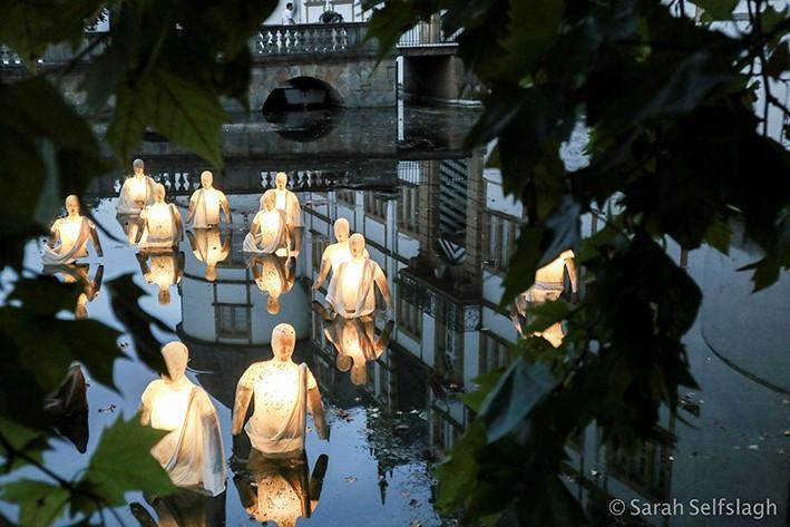 In het water van de Singel staan lichtgevende nomaden van Sacred Places, zij waden door het water en een menselijk figuur wacht op hen.